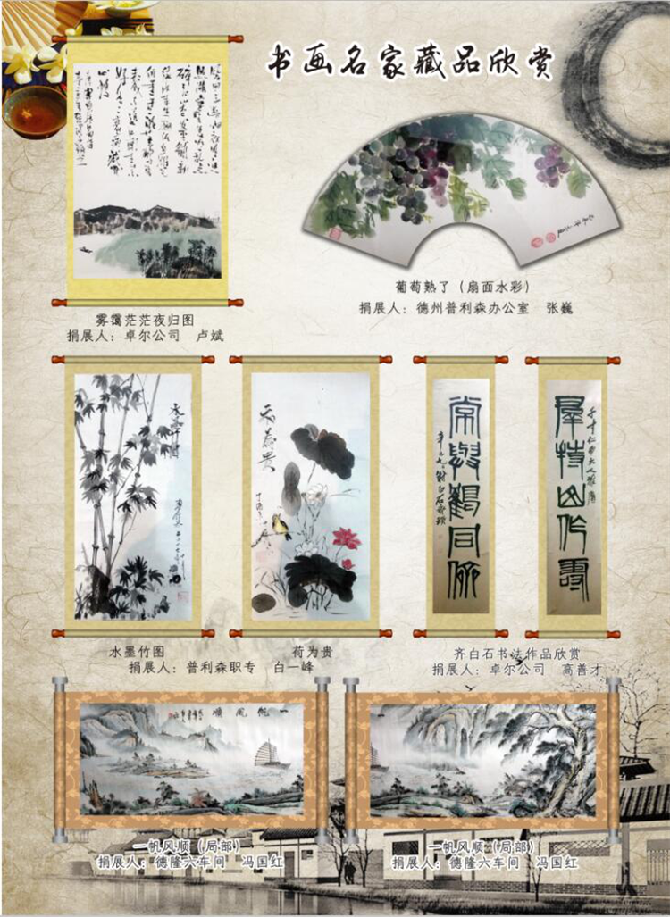 丹青敷彩歌盛世, 翰墨流霞頌和諧。愿普利森員工收藏展上那一件件栩栩如生的奇石,一幅幅行云流水的文字,一張張美輪美奐的圖畫,都將使我們感受到不僅僅是藝術(shù)的感染,文化的浸潤,更是心靈的升華,奮進(jìn)的動力。愿我們以此為集團(tuán)公司成立78周年,集團(tuán)公司改革發(fā)展20周年獻(xiàn)上最美好的祝福。