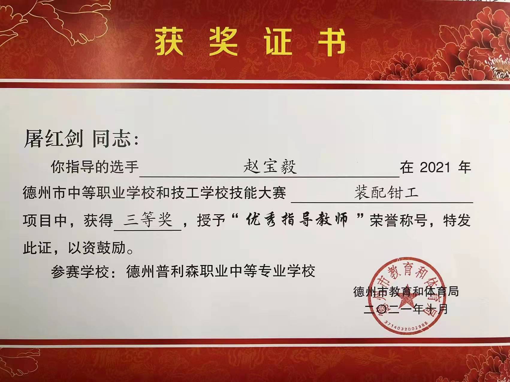 恭喜普利森高級技工學校三名同學在德州市技能大賽中獲得鉗工第三名、鉗工第一名及車工第三名的好成績!