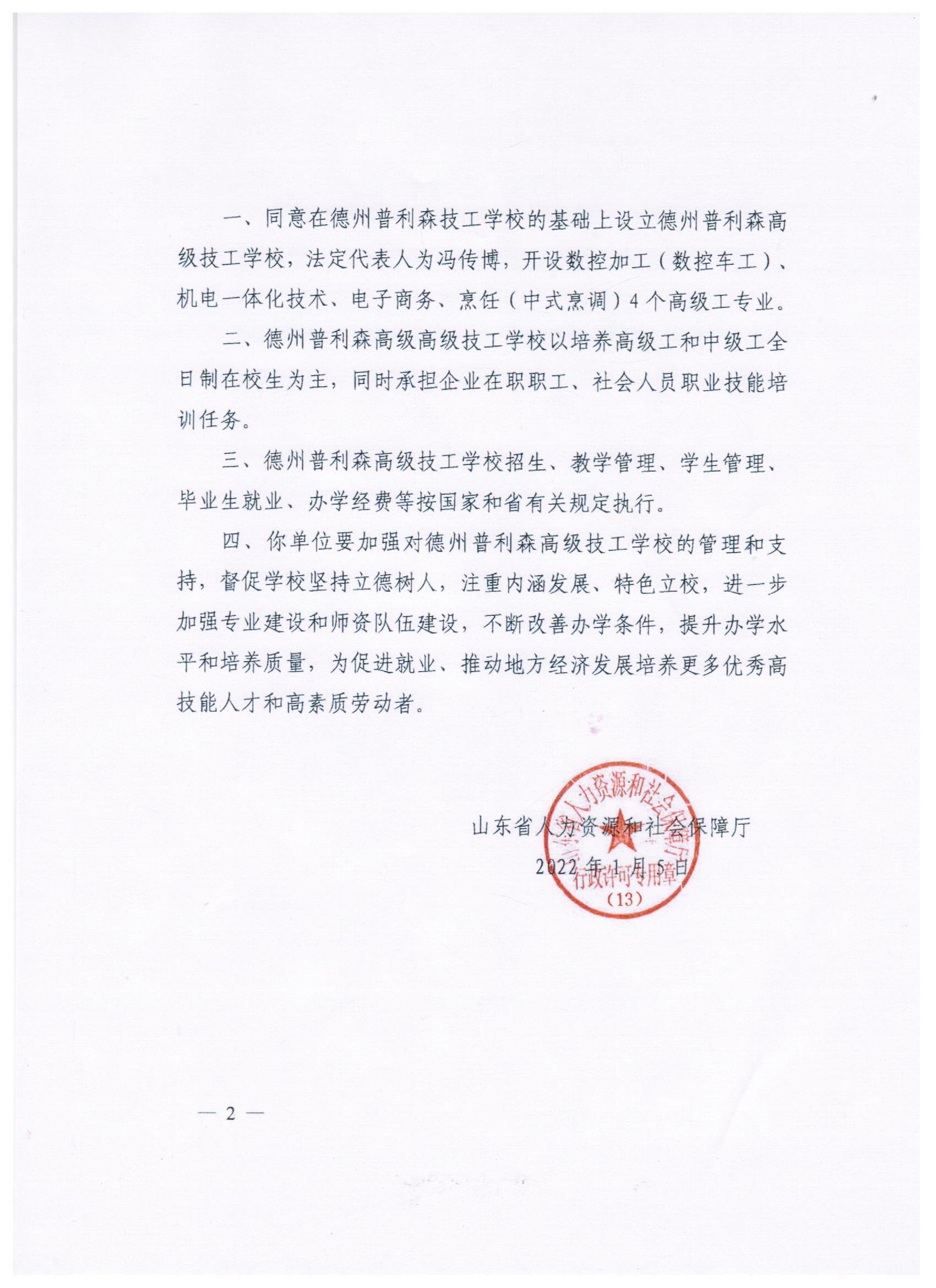 山東省人力資源和社會保障廳關于同意設立德州普利森高級技工學校的批復