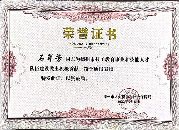 恭喜我校馬全雷、石翠芳、劉夫坤三位老師獲得人社局頒發的技工教育事業和技能人才隊伍建設積極貢獻榮譽證書